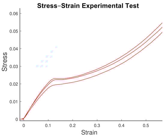 Regarding the strain behavior shown in Figure 6b, corresponding to the results of the FEM simulation analyzed at the nodes of the test specimen, Figure 12 provides an enlargement of the experimental tension test results. It illustrates that the same phenomenon occurs experimentally at the onset of the test. Initially, the test exhibits some linear behavior, but beyond a certain point (around a strain of 0.1 in Figure 12), there is a sudden drop in the linear behavior. According to our analysis, this drop occurs because out-of-plane deformations start to appear beyond this point. In the conducted experiment, these out-of-plane deformations would symmetrically manifest along the z-plane. For other cuts in the experimental tests, this change is not as pronounced, which we attribute to the resolution limitations of the testing equipment.