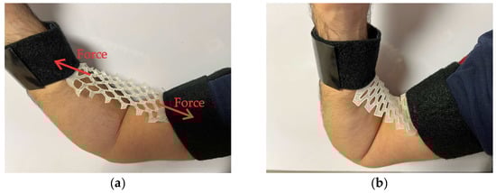 These structures are proposed for deployment in both deformable robot development and artificial muscle as potential applications. In Figure 13a, a proposed rehabilitation device is depicted, in which a force is being applied to the test specimen with rectangular cuts. This device can be tailored to the rehabilitation needs of the patient. In Figure 13b, the device is shown when no force is being applied (at rest state).