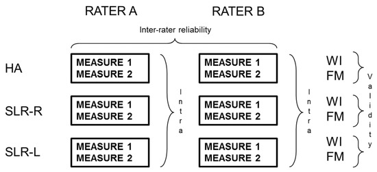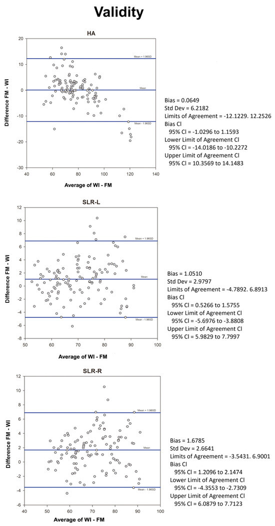 The Bland and Altman plots with accompanying 95% limits of agreement illustrate the wide range of measurement scores. For validity plots, comparisons between the FM and WI methods over the HA, SLR-L, and SLR-R tests include RA, RB, M1, and M2 scores. For the inter-reliability plots, comparisons between both raters RA and RB over the HA, SLR-L, and SLR-R tests include FM, WI, M1, and M2 scores. For the intra-reliability plots, comparisons between both measures M1 and M2 over the HA, SLR-L, and SLR-R tests include FM, WI, RA, and RB scores. The results (Figure 3 and Figure 4) indicate that both methods, the FM and WI, were unbiased in scoring SLR-R and SLR-L, and also the FM in the HA test. In contrast, a small bias existed whereby the WI tended to score higher regarding the HA test. RA and RB were unbiased in scoring over themselves, as well as M1 and M2.