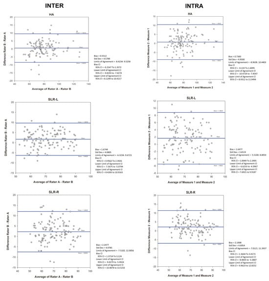 The mean angular measurement values for the intra- and inter-rater reliability analyses with SD, SEM, MCD90, and ICC (95% CI) are presented in Table 2 and Table 3. The data show excellent inter- and intra-rater reliability and for right and left SLR and HIP-ABD. Overall, the intra- and inter-rater reliability ICC ranged from 0.97 to 0.99. The MCD90 for the inter- and intra-rater reliability indicates that a change of equal to or greater than 5.7° (SLR-R), 5.6° (SLR-L), 5.1° (HA), 6.3° (SLR-R), 4.9° (SLR-L), and 5.4° (HA) indicates certainty that the change is not due to inertial variability or measurement error.