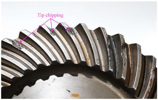 The majority of current studies on gear faults focus on spur or helical gears, with only a limited number of researchers exploring gear faults in SBGs. Furthermore, tooth tip chipping (see Figure 1), a significant aspect of SBG faults, has received very little attention in the existing literature. At present, there are four main methods for studying gear faults: (a) Finite element method (FEM). Jia S et al. [22] detailed the Finite Element Analysis (FEA) models for calculating the torsional stiffness and tooth load sharing ratio of the gears in mesh, considering spalling and crack damage. However, it is important to note that this method can be computationally intensive and sensitive to both the mesh element type and the density of the mesh used. (b) Analytic method. Wilk et al. [23] simulated the tooth tip chipping and crack faults, utilized the smoothed pseudo-Wigner-Ville distribution to analyze the residual vibration signal, and summed up the evolutionary process of fault on the spur gear. Tian X [24] and Wojnar G et al. [25] processed the vibration response of fault gear systems to detect the fault type. Yang Y et al. [26] derived the analytical equations for the rotating system of spur gears whilst considering tooth tip chipping. The more severe the tooth tip chip is, the greater the reduction in TVMS. Li G et al. [27] established a lumped parameter dynamic model of planetary gear with tooth tip chipping and derived the analytical equation of tooth tip chipping on composite planetary gears. Han J et al. [28] and Liu Y et al. [29] combined the analytical geometry method with the potential energy method to analyze the effects of varying degrees of tooth tip chipping. However, it is challenging to analyze the fault of the gears. (c) Semi-analytic method. Han H et al. [30] calculated the TVMS and transmission errors by LTCA considering angular contact and tooth fracture faults. Li Z et al. [31] proposed a mesh characteristics model of SBG that considered spalling fault based on LTCA and verified the accuracy using the finite element method. However, they only discussed the TVMS of the spalling fault and did not consider other gear faults and assembly errors. The LTCA method offers the advantages of both the FEM and the Analytic method and can obtain the results with high accuracy. However, the utilization of LTCA remains an area ripe for further exploration by researchers. (d) Experimental method. Dadon et al. [32] analyzed three types of gear faults by experiment and confirmed the experimental results using simulations. Halim et al. [33] developed a method of detecting gear faults which combines wavelet and time domain averaging and uses it to detect tooth tip chipping. Although this method yields accuracy, simulating large devices is challenging, and analyzing errors becomes difficult.
