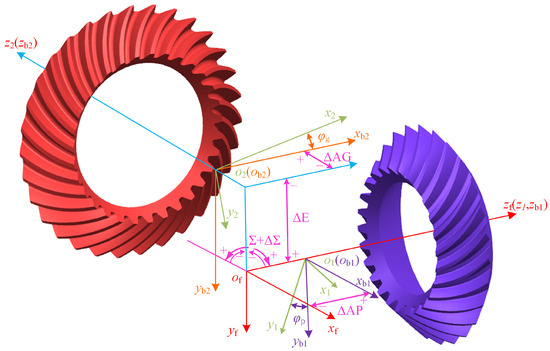 As shown in Figure 2, S1(x1, y1, z1) and S2(x2, y2, z2) are coordinate systems of pinion and gear, respectively; Sb1(xb1, yb1, zb1) and Sb2(xb2, yb2, zb2) are the auxiliary coordinate systems; and Sf(xf, yf, zf) is the meshing coordinate system. When transforming coordinate systems of pinion and gear into the meshing coordinate system, it can introduce assembly errors through the transfer matrix. This can be described as: