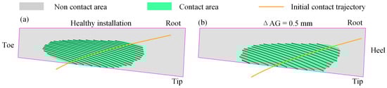Contact area of (a) healthy installation and (b) ΔAG = 0.5 mm.
