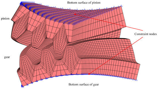 As shown in Figure 4, a three-tooth model is established in MATLAB (R2021b) software. The proposed method needs only to get the global compliances obtained by the traversal loading method. Therefore, we constrain all degrees of nodes at the bottom surface of the pinion and gear when simulating the working conditions of SBG pairs. The elements used are 8-node hexahedral elements. Moreover, it is worth noting that the grids in the contact area are not fine, as satisfactory global compliances can be achieved through spatial interpolation and contact compliances can be estimated using empirical formulas instead of direct contact calculations.
