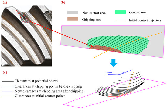 The proposed method can accurately incorporate and take into consideration the actual shapes of the tooth tip chipping. Initially, it needs to extract the shape (see Figure 5a) of tooth tip chipping from the gear affected by the chipping fault. When tooth tip chipping occurs, there is a reduction in the clearances between the pinion and gear within the chipping area (see Figure 5b). For simulating the occurrence of tooth tip chipping, this paper adjusts the clearances (see Figure 5c) between the potential contact points within the chipping area to represent the chip. The increased values in clearance reflect the depth of tooth tip chipping, whereas the extent of the chipped area is presented by the potential contact points for which clearances are altered. Subsequently, the equation governing compatibility is solved anew using the updated clearances, enabling the analysis of the mesh characteristics of the gear under tooth tip chipping fault.