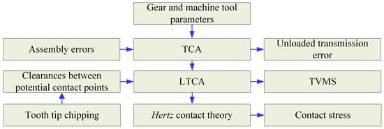 The method presented in this paper is outlined in a simplified flowchart depicted in Figure 6. Firstly, based on the gear and machine tool parameters, the assembly errors are incorporated into the TCA to acquire the data for LTCA and to calculate the unloaded transmission error. Subsequently, LTCA is executed. Prior to assessing the compatibility, tooth tip chipping is indicated by noting the changes in clearance within the tooth tip chipping area. Following this, the TVMS can be computed using the compatibility equation. Finally, contact stress is determined using the Hertz contact formula, leveraging the curvature and normal force at potential contact points obtained from LTCA.