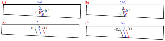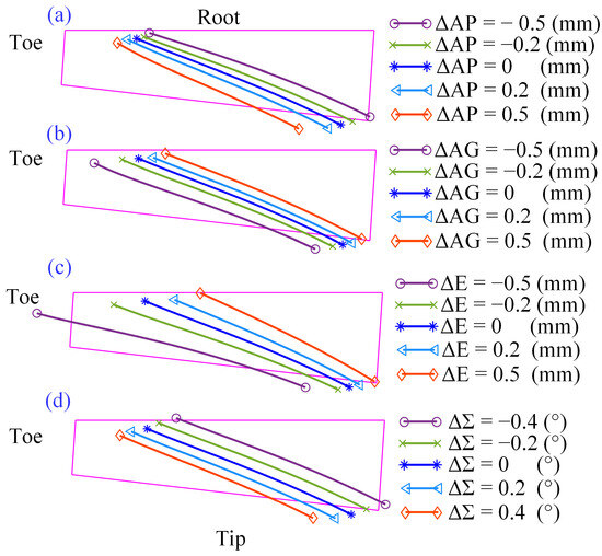 Comparison of contact trajectories due to the assembly errors in Han’s paper [16]: (a) ΔAP; (b) ΔAG; (c) ΔE; (d) ΔΣ.