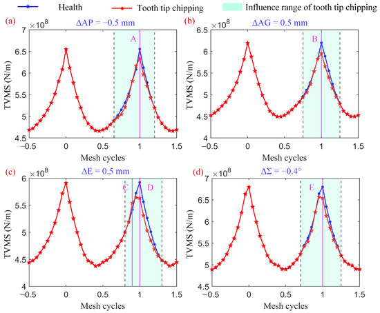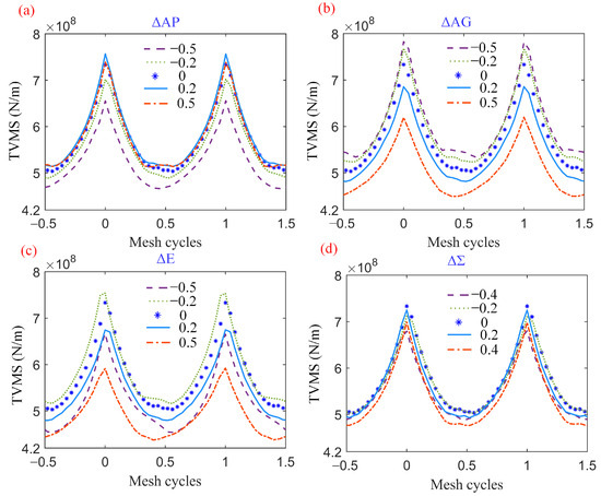 TVMS of different assembly errors considering tooth tip chipping: (a) ΔAP = −0.5 mm; (b) ΔAG = 0.5 mm; (c) ΔE = 0.5 mm; (d) ΔΣ = −0.4°.