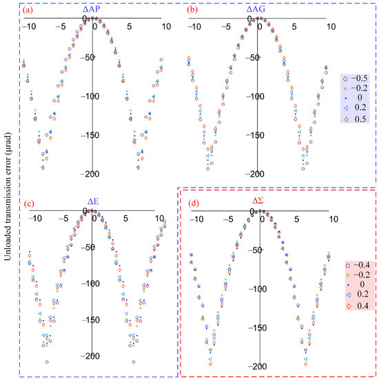 Unloaded transmission error of SBGs considering different assembly errors: (a) ΔAP; (b) ΔAG; (c) ΔE; (d) ΔΣ.