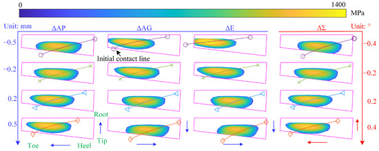 The contact stresses of SBGs considering different assembly errors are shown in Figure 11. It is evident that the contact area, which consists of potential contact points wherein the contact stress exceeds zero, and the initial contact trajectory of ΔAP and ΔΣ move from heel and tip to toe and root. On the contrary, those of ΔAG and ΔE move from the toe and root to the heel and tip. In addition, with the movement of the contact area, the edge contact and the increase of tip stress appear gradually. This phenomenon alters the load distribution across the tooth surface and elevates the risk of tooth tip chipping. Moreover, it diminishes the service life of SBGs.