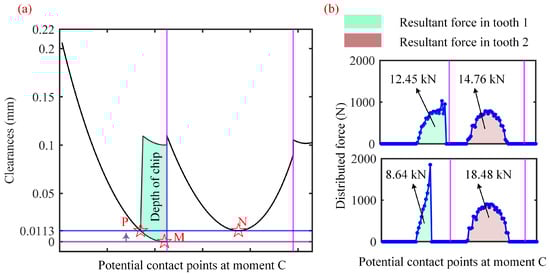 The clearances and distributed force between potential contact points at moment C: (a) the clearances; (b) the distributed force.