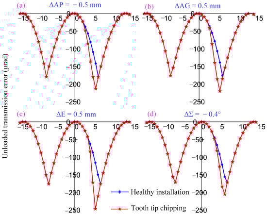Unloaded transmission error of different assembly errors considering tooth tip chipping: (a) ΔAP = −0.5 mm; (b) ΔAG = 0.5 mm; (c) ΔE = 0.5 mm; (d) ΔΣ = −0.4°.