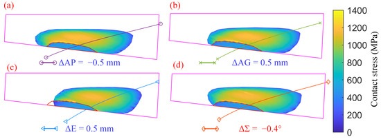 Contact stress of different assembly errors considering tooth tip chipping: (a) ΔAP = −0.5 mm; (b) ΔAG = 0.5 mm; (c) ΔE = 0.5 mm; (d) ΔΣ = −0.4°.