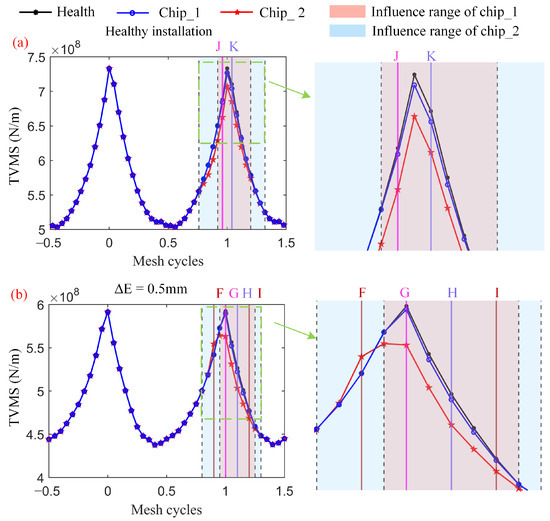 The effects of different sizes of chips may lead to different changes in mesh characteristics. Figure 16 showcases the TVMS for different chip areas under healthy installation and E = 0.5 mm. Figure 17 illustrates the unloaded transmission error and contact stress for different chip areas. There are two sizes of tooth tip chipping to compare and analyze, Chip_1 and Chip_2 (see Figure 17). Firstly, when the installation is healthy, the maximum reduction of Chip_1 is 0.91% and this appeared at moment K (see in Figure 16a), and the maximum reduction of Chip_2 is 3.56% and this appeared at moment J (see in Figure 16a) under healthy installation. Following this, when the installation is ΔE= 0.5 mm, the reductions at moments F, G, H, I are listed in Table 3 under ΔE = 0.5 mm. The max reduction of Chip_1 is 0.8% and this appeared at moment H (see in Figure 16b) and the max reduction of Chip_2 is 4.92% and this appeared at moment G (see in Figure 16b). It is simple to deduce that assembly errors increase the reduction of TVMS under tooth tip chipping. Why Chip_1 decreases the healthy installation is due to single tooth contact when Chip_1 happens.