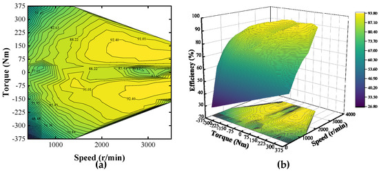 Two- and three-dimensional efficiency maps of the electric motor are shown in