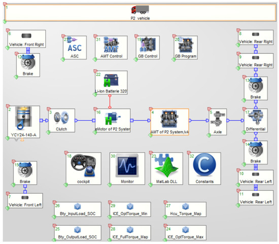 AVL-Cruise v.2019 is a piece of software developed by AVL for the power components of the whole vehicle; it can be used to study the fuel consumption and dynamics of different vehicles under different working conditions. The way the software divides the whole vehicle into several small modules makes it easy for the user to build different vehicle models according to their own ideas, and its complete solver can quickly output accurate results; therefore, AVL-Cruise v.2019 software was used in this study, and whole-vehicle modelling was carried out based on the topology of the P2 hybrid vehicle as described in the previous section. The specific steps are as follows: