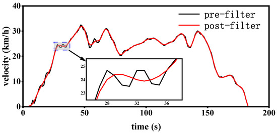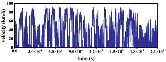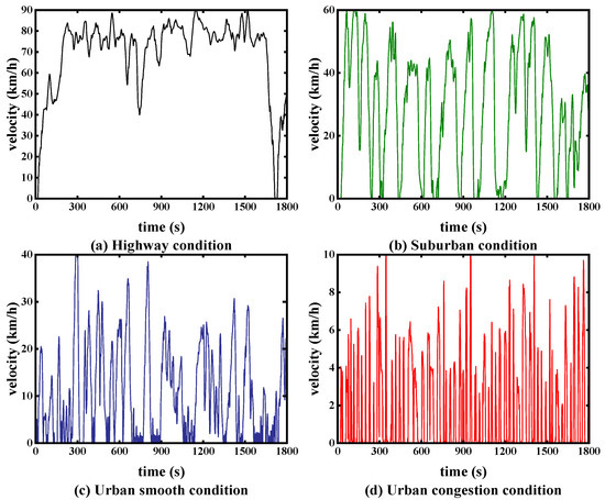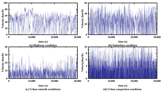 Figure 13 shows some of the time–velocity curves synthesised for the four conditions, where (a), (b), (c), and (d) were synthesised using only kinematic segments of the highway, suburban, urban smooth, and urban congestion working conditions, respectively, and parameter optimisation was performed under each of the four conditions.