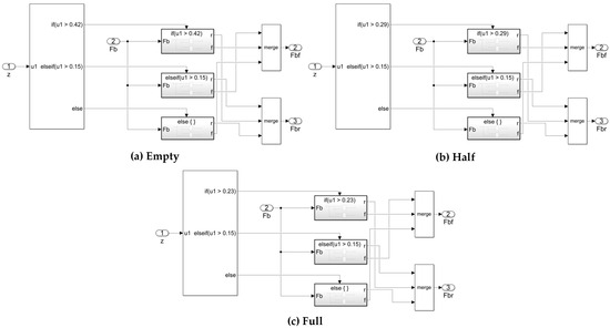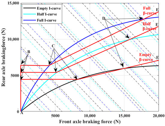 According to the level of braking intensity, braking is divided into four modes: light, medium, heavy, and emergency braking. As the rear wheel first locking in the braking process represents an unstable condition, an empty-, half-, and full-load/front- and rear-axle braking force distribution strategy was developed, based on the comprehensive consideration of the f-group line (the front wheel first locking and the rear wheel not being wrapped), ECE braking regulations, and the ideal braking force distribution curve of different loads. Brake force distribution curves for the front and rear axles are shown in