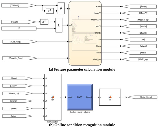 Simulink is a visual simulation tool in Matlab that is widely used in modelling and simulation applications for linear systems, nonlinear systems, digital control, and digital signal processing, and it can convert the constructed control model into a DLL file to perform data transfer and a joint simulation with AVL-Cruise software to improve research efficiency. Thus, based on the regenerative braking strategy designed in the previous chapters, in this study, the regenerative braking strategy model based on condition identification was built in Simulink, as shown in