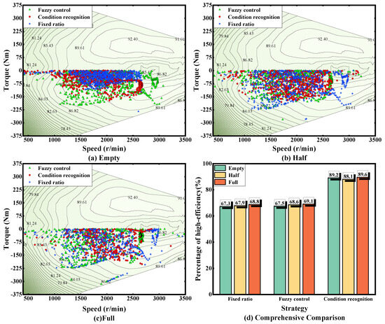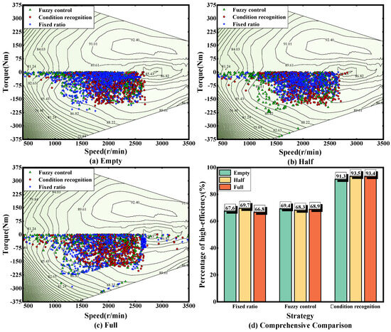 Figure 17 shows the electric motor working points during braking under three loads under C-WTVC conditions, from which it can be clearly seen that the regenerative braking strategy based on the condition identification in this paper is obviously more clustered in the medium- and high-efficiency range during braking, with fewer low-speed and low-torque working points. On the other hand, the electric motor working points are more scattered for the fuzzy control strategy and the fixed-ratio strategy. The period in which the electric motor efficiency is higher than the 89% contour is referred to as the high-efficiency interval. Within this interval, the proportions of the regenerative brake strategy based on condition detection under empty-, half- and full-load states are 89.2%, 88.1%, and 89.6%, respectively; for the fuzzy control strategy, the proportions are 67.5%, 68.6%, and 69.1%, respectively; and for the fixed-ratio strategy, they are 67.3%, 67.9%, and 68.8%, respectively. It can be seen that the regenerative braking strategy based on the identification of the working conditions can effectively limit the electric motor to work in the high-efficiency zone and increase the recovery efficiency.