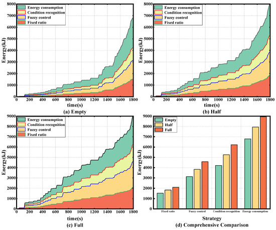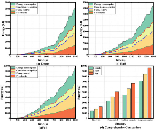 Figure 21 shows a comparison of the total energy consumed and energy recovered for braking in the three load states under a synthetic cycle, from which it is clear that the strategy of this paper recovers more energy at any load.