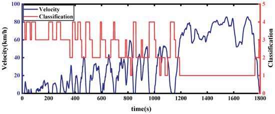 Figure 16 shows the results of the working condition identification for the C-WTVC; the red line is the category of a moment identified by the COA-BPNN, where 1, 2, 3, and 4 correspond to highway, suburban, urban smooth, and urban congestion conditions, respectively; the blue line is the vehicle velocity; and the accuracy of the identification results is 97.3%, indicating an almost perfectly accurate recognition.