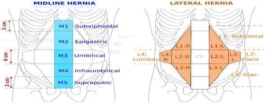 Classification of hernias (like all scoring systems used in medicine) based on their localization and size enables a comparison of research results of similar types of hernias and makes the planning of future studies easier. There are different nationwide datasets [28]. The European Hernia Society (EHS) classification of ventral hernias is a commonly adopted scoring system and is also used in the EHS registry [29,30]. Figure 1 shows this simple classification method and its graphical presentation.
