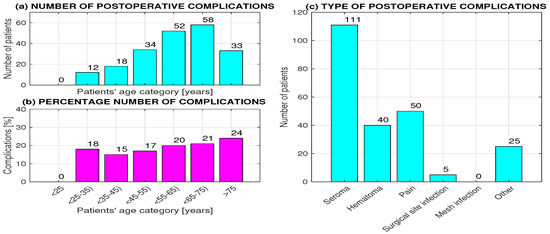 Figure 2 presents the statistical survey of groin hernia repair (GHR) hernia surgery resulting from the European hernia database for the subset of records between the years of 2018 and 2023 with complete facts about the treatment. It presents the number of postoperative complications in seven age patients’ categories and the percentage number of complications related to the complete number of complications in each age band. The type of postoperative complications is presented in Figure 2c. The relatively extensive number of complications motivates the study of their reasons to optimize the treatment process.
