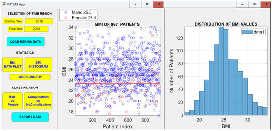 The graphical user interface (GUI) has been developed to extract specific information from the extensive and continuously expanding European hernia database. The required data can be processed using the proposed algorithm and presented to the user to analyze previous surgeries and propose the optimal solution for new patients. Figure 3 illustrates the body mass index of individuals in the EHS registry of GHR among hernia male and female patients with their mean values and their distribution. The total number of records acquired in the range of years was reduced to 1088 GHR patients with complete database records. This characteristic, which serves as a measure of body fatness, is calculated by dividing a person’s weight (in kg) by the square of their height (in m). BMI is a significant factor associated with worse outcomes and plays a crucial role in decision-making regarding the type of operation, operative approach, and choice of mesh.