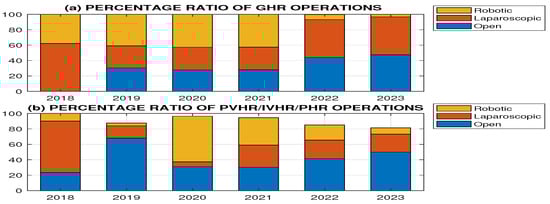 Percentage ratio of operation types (open, laparoscopic, and robotic) during selected years of (a) GHR surgery and (b) PVHR/IVHR/PHR treatment.