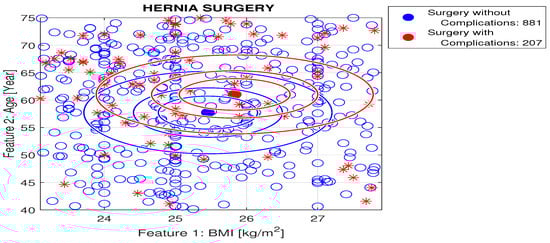 The GUI and selected data from the EHS database are stored at the IEEE DataPort (http://ieee-dataport.org/11319, (accessed on 6 March 2024)). This repository also includes a video abstract of the paper. In Figure 5, the classification of GHR surgery outputs presenting the comparison of GHR surgery results with (207) and without post-surgery complications (881) based upon two features (BMI and age) for central areas of features are presented. Post-surgery complications occurred for approximately 19% of patients. Figure 5 displays the mean values of these two categories and c multiples of their standard deviations (c = 0.2, 0.3, and 0.5) without considering the gender of the patients.