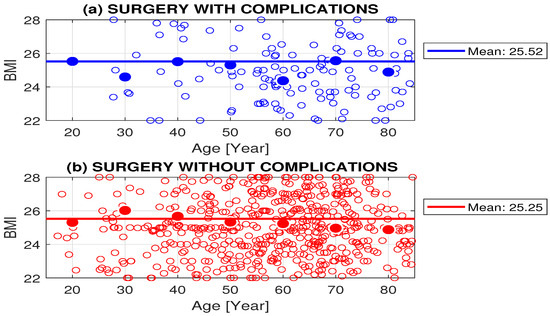 Distribution of GHR repairs for patients with various body mass indexes and age (a) for surgery with and (b) without complications (with blue and red solid dots standing for mean BMI values for patients in the age range of 10 years and surgeries without and with complications, respectively).