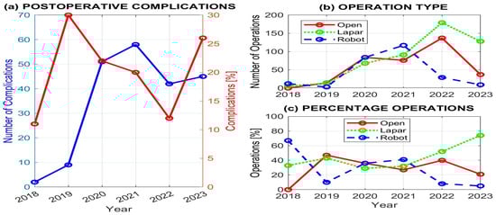 Resulting evaluation of GHR hernia treatment presenting (a) absolute and relative postoperative complications of 1088 patients followed between years of 2018 and 2023 and (b,c) absolute and relative number of open, laparoscopic and robotic operations during last 6 years.