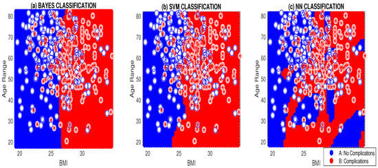 Classification of the GHR hernia surgery into two classes (A: Surgery with no complications, B: Surgery with Complications) by (a) the Bayesian, (b) the SVM, and (c) neural network methods using the BMI and age of the patient as distribution features.