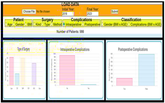 Figure 9 presents selected results based on the web access to the European hernia database and evaluation of specific questions. In the given case, it provides statistics on the type of surgery, intra-operative complications during the hernia surgery, and postoperative complications for the set of GHR patients treated during the period of 6 years between the years of 2018 and 2023.