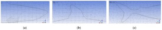 Incorporating turbulence model equations is essential for capturing the turbulent phenomenon within the flow. Turbulence encompasses dynamic fluctuations in both time and space within the velocity and pressure fields. This intricate process can profoundly influence the flow’s behavior. Turbulence arises when the inertial forces exerted on the fluid outweigh the viscous forces, typically manifesting in flows with high Reynolds numbers. Additionally, turbulence can be induced by surface roughness, giving rise to secondary flow patterns []. Mesh for mathematical modeling is shown in Figure 5.