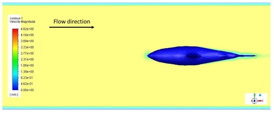 The flow velocity across the range of 1 to 4 m/s exhibits an interesting trend in the context of drag coefficient calculations. While one might intuitively expect an increase in drag coefficient with higher flow velocities due to increased fluid resistance, the observed results from both theoretical and numerical methods are different. The average theoretical drag coefficient recorded in these conditions is approximately 0.256. This finding suggests that the fish model under consideration may exhibit unique hydrodynamics, leading to a nonlinear relationship between velocity and drag (as shown in Table 3). Conversely, when employing numerical methods to calculate the drag coefficient, the trend still shows a decrease in this coefficient as the flow velocity increases, although the decrease is not substantial. The average simulation-based drag coefficient under these conditions is approximately 0.275. This observation implies that the simulation accounts for certain complexities or factors that influence drag differently than what is typically captured by theoretical measurements.