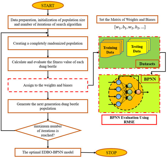 The initial parameters of the BPNN are randomly assigned, so the numerous parameters lead to unstable model calculation. Optimizing the BPNN using EDBO can improve the prediction performance of the model. The main idea of an EDBO-BPNN is to update the BPNN’s weights and thresholds by constantly updating the location of the dung beetle population until a global minimum is found that represents the optimal solution to the initial weights and thresholds. The flow of an EDBO-BPNN is shown in Figure 3. Firstly, the parameters of the BPNN are determined, including the hidden layer, number of hidden nodes, training cycle, model learning rate, and activation function. Secondly, the optimized BPNN prediction model is trained using the training set. The optimization methods used are EDBO-BPNN, BDB-BPNN, JAYA-BPNN, PSO-BPNN, GWO-BPNN, and WOA-BPNN. Finally, we studied the training model using a test set and evaluated the predictive power of the four models based on statistical parameters such as coefficient of determination (R2), RMSE, mean absolute error (MAE), and mean absolute percentage error (MAPE). The predicted values of six kinds of neural network models are compared with experimental values and the predictive ability of the models is analyzed.