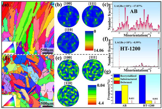 Figure 4a,d show the EBSD observations of the two grain morphologies, indicating that they show significant changes in grain size and preferred crystal orientation. The microstructure of the AB sample consists mainly of columnar grains with a strong <100> texture and a maximum multiples of uniform density (MUD) value of 14.06, as shown in Figure 4b. Figure 4e displays that complete recrystallisation occurs in the microstructure of the HT-1200 sample, which consists mainly of equiaxed grains with relatively random grain orientation and a weak texture (max MUD = 4.40). The percentage of low angle grain boundaries (LAGBs) in AB specimens was 17.07%, as shown in Figure 4c. After heat treatment, the percentage of LAGBs in the HT-1200 sample decreased due to the occurrence of recrystallization, and a large number of TGBs appeared at the 60° position, as shown in Figure 4f. In addition, compared with the AB sample, the proportion of recrystallized grains in the microstructure of the HT-1200 specimen increased dramatically, whereas the deformed grains almost completely disappeared, as shown in Figure 4g.