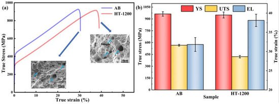 The mechanical properties of the AB and HT-1200 samples are shown in Figure 5a. The yield strength (YS) of the specimens decreased after heat treatment at 1200 °C, but the elongation increased significantly. The decrease in YS may be attributed to the dissolution of Laves and carbides. The inset shows the fracture surfaces of both samples. A high number of dimples and tear ridges are observed on the fracture of both samples, indicating that both samples are ductile fractures. The HT-1200 sample has a larger dimple size and a deeper tear ridge, which has a better plastic deformation capacity than the AB sample. Figure 5b presents the statistical histogram of tensile test results.