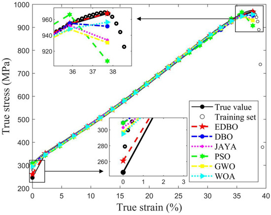 Figure 6 shows the comparison between the prediction results of different hybrid models and the actual data. For HT-1200, the prediction results of the EDBO-BPNN model are closer to the actual values in the initial region and the peak region of the stress–strain curve, indicating that the EDBP-BPNN model is superior to other comparison models in terms of prediction accuracy and can predict the actual experimental data more accurately. In the data of the later stage of the test, the stress of the fracture part has a sudden change, so the stress prediction of this part is the most difficult, yet the model proposed in this paper can still predict almost the same results as the test. In summary, among all the compared algorithms, the model proposed in this paper shows the best prediction performance in both the initial region of stretching and the region where the stress changes abruptly.