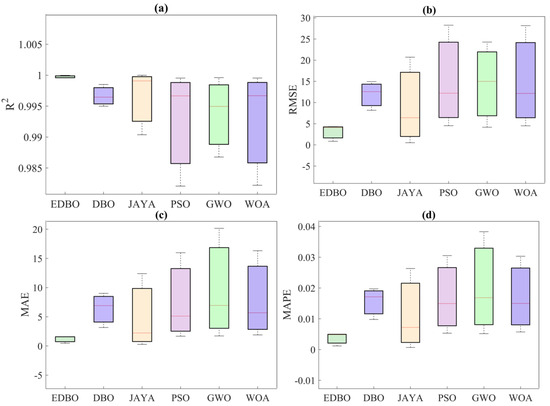 Figure 7 visualizes the prediction evaluation metrics of all the hybrid models in the form of box-line plots to highlight the differences in the comparison of prediction performance. Among them, the EDBO-BPNN model outperforms the other models compared in all prediction evaluation metrics. The R2 is 0.999964, RMSE is 1.1180, MAE is 0.5534, and MAPE is 0.1502% for the evaluated index of HT-1200. Table 1 presents the detailed data. With the same number of iterations, the EDBO-BPNN model can obtain better model parameters and thus achieve higher prediction accuracy.