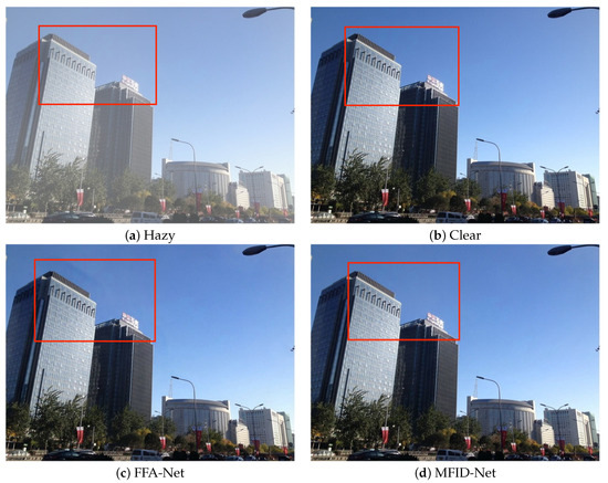 To further validate the superiority of MFID-Net in dehazing large areas of color blocks such as roads and sky, we selected parts of the outdoor dataset for comparison. The dehazing comparison is shown in Figure 10. It is clearly seen that DCP, when handling areas like the sky and road, tends to generate high-saturation images, and sometimes produces black blocks when dealing with large white areas. The images produced by AOD-Net have low contrast in the background. When GCA, GridDehazeNet, and FFA-Net deal with large color block areas such as sky and roads, their restoration of image details is not ideal, often resulting in problems like black blocks and ghosting. In contrast, MFID-Net, when handling large color block areas, is superior to the aforementioned methods in terms of restoring image color and preserving image details. More importantly, it also reduces the occurrence of undesirable phenomena such as black blocks and ghosting.