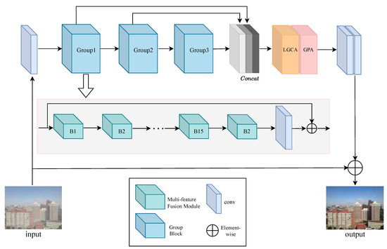 Based on the FFA-Net architecture, we propose the multi-feature fusion image dehazing network (MFID-Net) as the prediction function F to approximate the clear image Y with high fidelity; the differences between FFA-Net and MFID-Net are illustrates in Figure 2. In Figure 3, MFID-Net takes the as input and extracts shallow features through a convolution operation layer. Subsequently, these features are fed into three consecutive Group Blocks for further feature extraction. Depth fusion across different levels is achieved through residual connections, resulting in the feature map , a process detailed in Equation (5). Specifically, each Group Block is composed of 15 multi-feature fusion (MF) modules and a convolutional layer, with residual connections also employed within the Group Block to enhance the transmission and fusion of features. Next, lightweight gated channel attention (LGCA) and gated pixel attention (GPA) are utilized to re-calibrate the features at the channel and pixel levels to enhance the dehazing effect. Finally, the predicted haze-free image is generated through two convolution operations, a process that can be represented by Equation (6).