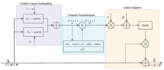 Channel Normalization Layer: Normalization layers are employed to accentuate channels with high feedback values and suppress those with lower feedback values, thus achieving a dynamic adjustment of features [40,41,42]. LGCA utilizes -norm formulations to normalize the channels, optimizing the weight distribution among them. The formula for channel normalization is as follows: