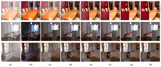 Indoor results. (a) Hazy, (b) DCP, (c) AOD-Net, (d) GCA-Net, (e) GridDehazeNet, (f) FFA-Net, (g) MFID-Net, (h) Clear.