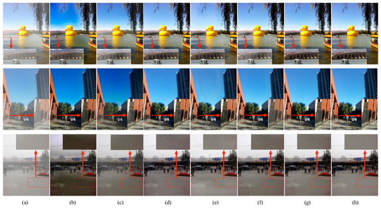 The evaluation of dehazing algorithms is commonly divided into subjective and objective assessments. Subjective assessment is primarily based on human visual perception to judge factors such as image clarity, color fidelity, and contrast. This method of evaluation is intuitive and easily understood, yet it possesses a certain degree of subjectivity due to the influence of personal preferences and observation conditions. Objective assessment, on the other hand, is conducted through quantifiable metrics such as peak signal-to-noise ratio (PSNR) and structural similarity index measure (SSIM), which quantify the dehazing effects and provide a replicable, standardized evaluation outcome.