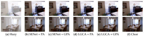 To verify the effectiveness of LGCT in image dehazing tasks, we replaced the SE-Net channel attention mechanism used in FFA-Net with LGCT. In Table 4 and Figure 12, the results show that the model using LGCT performs better in image dehazing tasks, not only improving the values of SSIM and PSNR evaluation indicators but also reducing the number of network parameters. In Figure 12, it is evident that LGCT has successfully reduced the phenomena of halo and dark block generation when recovering large-area color blocks in images.