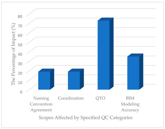As shown in Table 2, there are many different QC categories, each with its specific parameters and standards to meet. For example, categories like “export view’s name” and “BIM model warnings” are checked to ensure accuracy and follow project standards. Categories like “element phase” and “element workset” are reviewed to ensure they are consistent with the project timeline and segmentation. Categories like “door element code” and “MEP QC” significantly impact multiple project aspects. Figure 1 shows how much these QC categories influence various project scopes. The “QTO” category is significantly affected (73%), emphasizing its importance in cost estimation and budgeting. “BIM Modeling Accuracy” (35%), “Coordination” (19%), and “Naming Convention” (19%) are also significantly impacted, showing that these QC categories play a vital role in different project aspects. This detailed analysis of Table 2 and Figure 1 helps us understand the QC categories and their broad impact on the BIM project. This comprehensive QC approach aims to improve the accuracy, efficiency, and reliability of BIM models, ensuring they meet the high standards required for a successful project in all disciplines involved.