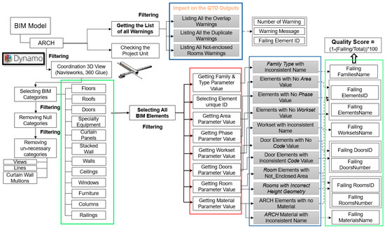 As construction projects become more complex, the precision of information becomes increasingly crucial, which requires a considerable amount of communication and information transmission. Inadequate or insufficient data transmission often leads to project failure. The architectural, engineering, and construction (AEC) industry is experiencing a significant shift from conventional Computer-Aided Drafting (CAD) techniques to Building Information Modeling (BIM), facilitating effective data management and rapid decision making. BIM utilizes digital modeling tools to enhance the design and management of a project with greater efficiency [1]. According to Singh [2], 72% of US construction companies use BIM to decrease project costs and increase efficiency. The advancement of computer-based BIM applications enables the creation of multi-criteria parametric designs for construction projects through the use of objects characterized by their identity, attributes, and relationships. These applications facilitate the creation of automated compliance checking (ACC) for building designs [3], a development that has significantly contributed to increasing time and cost efficiencies. Code compliance in building construction refers to the adherence to local, state, and national building codes and regulations that set minimum standards for the design, construction, operation, and maintenance of buildings and structures. However, one of the main requirements of ACC is the assurance of the quality of the BIM model. Public institutions in countries such as the United States (US), the United Kingdom (UK), and Singapore have required the use of BIM in design delivery and have promoted automated checking and evaluations of BIM quality [4]. “BIM model quality” means conformance to various requirements, including LOD, procedures, specifications, and the accuracy of building information model geometries. A quality check (QC) in BIM projects involves systematically checking and verifying the accuracy and quality of BIM models and their components against relevant documents such as the BEP, LOD, LOI, etc.